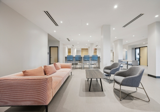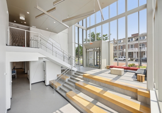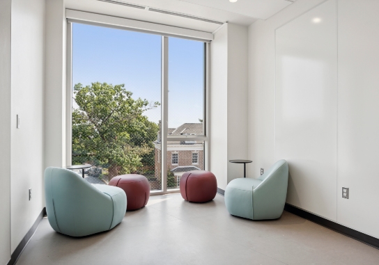 The Simon Center offers lighted alcoves with quiet sitting areas as well as collaborative spaces in the center core with easy access to the 30 faculty offices located on the perimeter of the floors. Meeting spaces are located throughout.