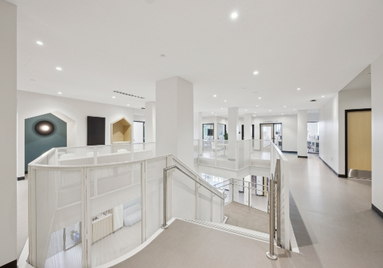 The building has a central stair, a tall glass foyer, abundant natural light, and improved accessibility.