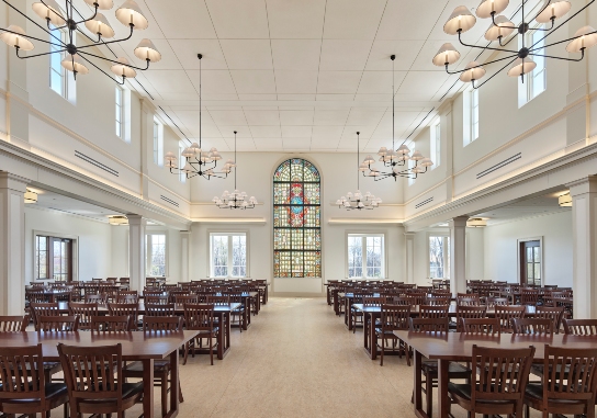 The Student Life Center contains the new Immaculate Conception Chapel with tall stained glass windows, library, administrative and faculty offices, conference center, classrooms, multi-purpose auditorium that can accommodate 150 people, refectory (dining hall for 220 people), and kitchen/servery.